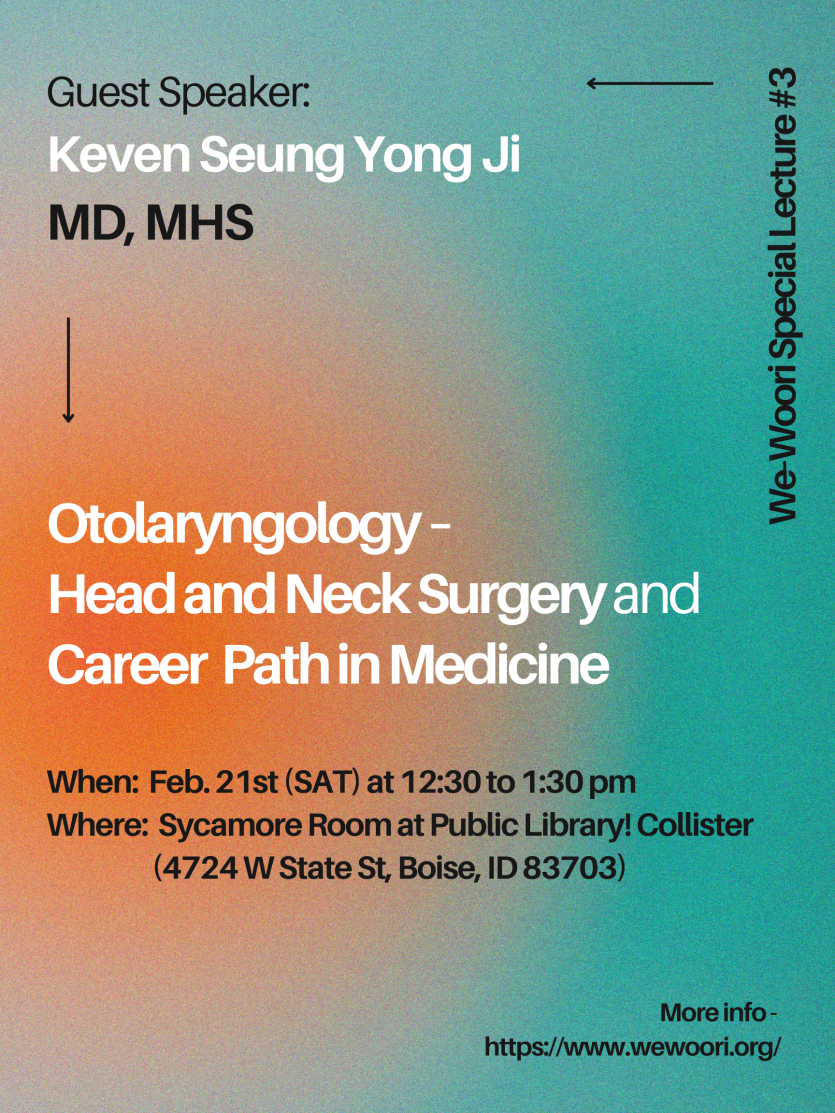 위우리(We-Woori 홈페이지) 특강 그 세 번째이자, 26년도 첫 번째 특강은 이비인후과 전문의로 메리디안에서 진료하고 계신 Keven Seung Yong Ji 박사 (MD, MHS) 강의로 시작합니다. 일정과 장소는 다음과 같습니다.